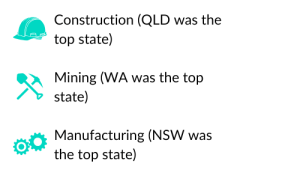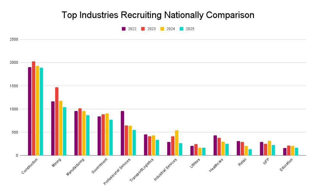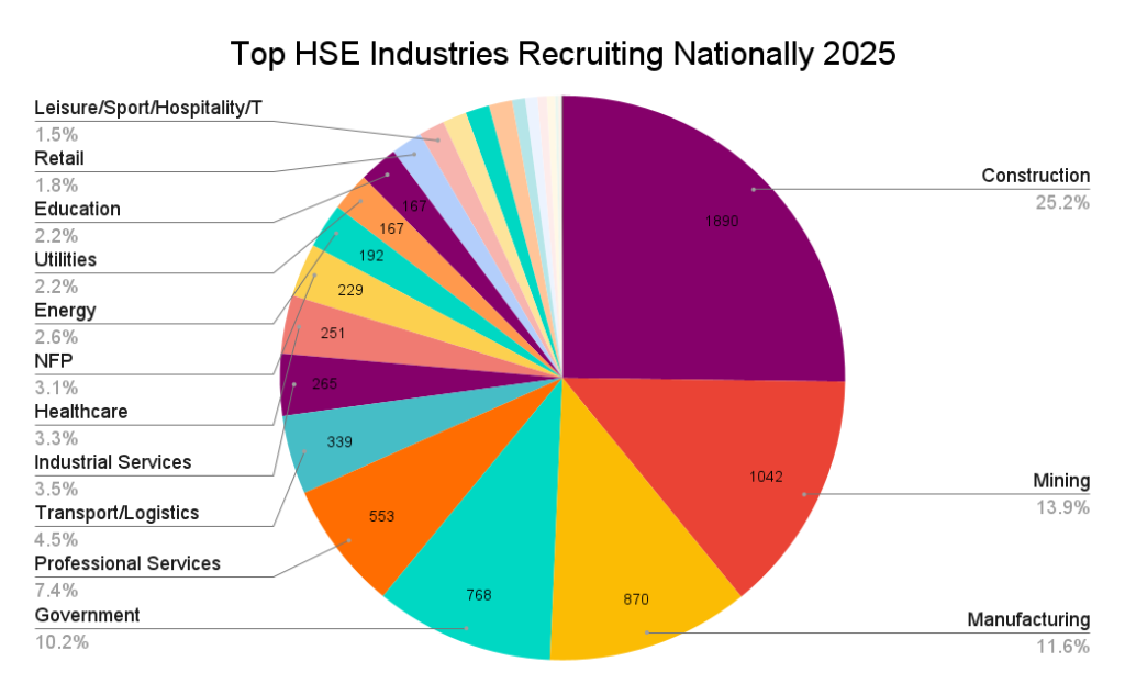 Just like in 2022, 2023 and 2024, construction continued to dominate as the number one employer of health and safety professionals across most States in 2025, except WA, where mining led and TAS, where Government led.