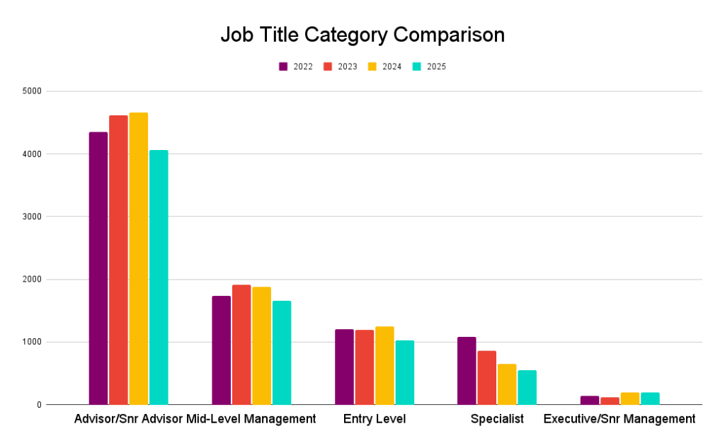 Unsurprisingly, in 2025, the majority of vacancies advertised were allocated to Advisor/Snr Advisor/Business Partner/Consultant level (54% of vacancies).